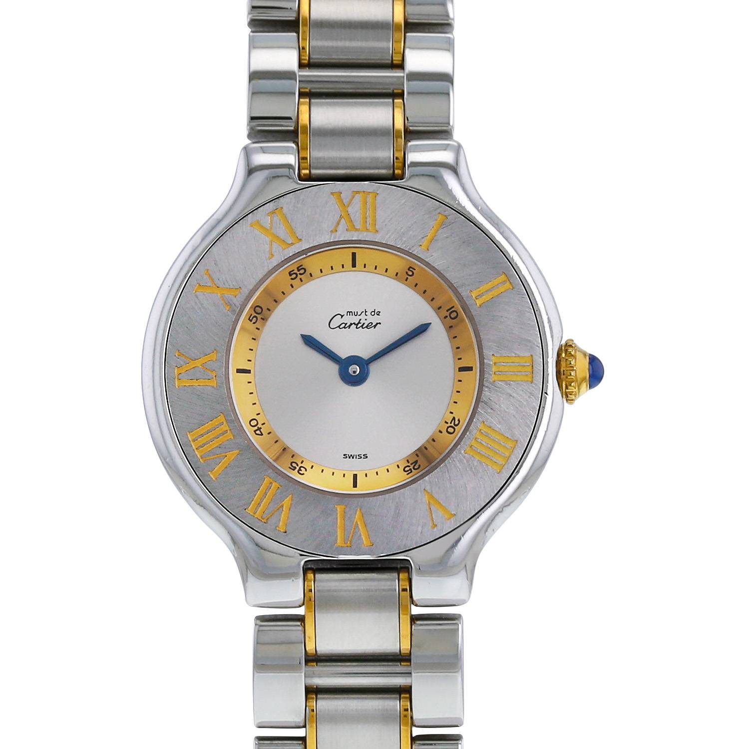 Orologio da polso Cartier Must 21 in oro e acciaio. Cassa rotonda in oro e acciaio, fondo cassa avvitato, lunetta graduata, corona scanalata incastonata con un cabochon in zaffiro.