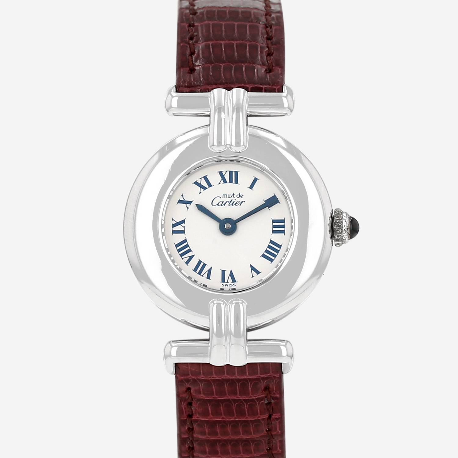 Orologio da polso Cartier Must Colisée in argento. Cassa rotonda in argento, fondo cassa avvitato, corona scanalata incastonata con un cabochon in zaffiro.