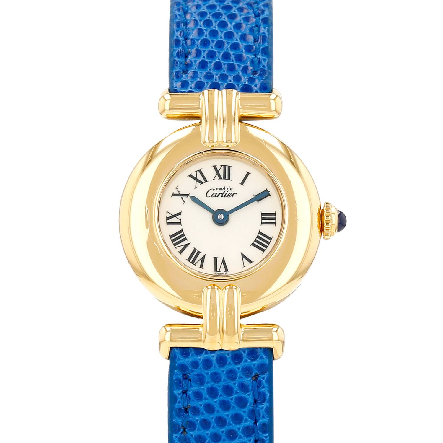 Orologio da polso Cartier Must Colisée in vermeil. Cassa rotonda in vermeil, fondo cassa avvitato, corona incastonata con un cabochon in zaffiro.