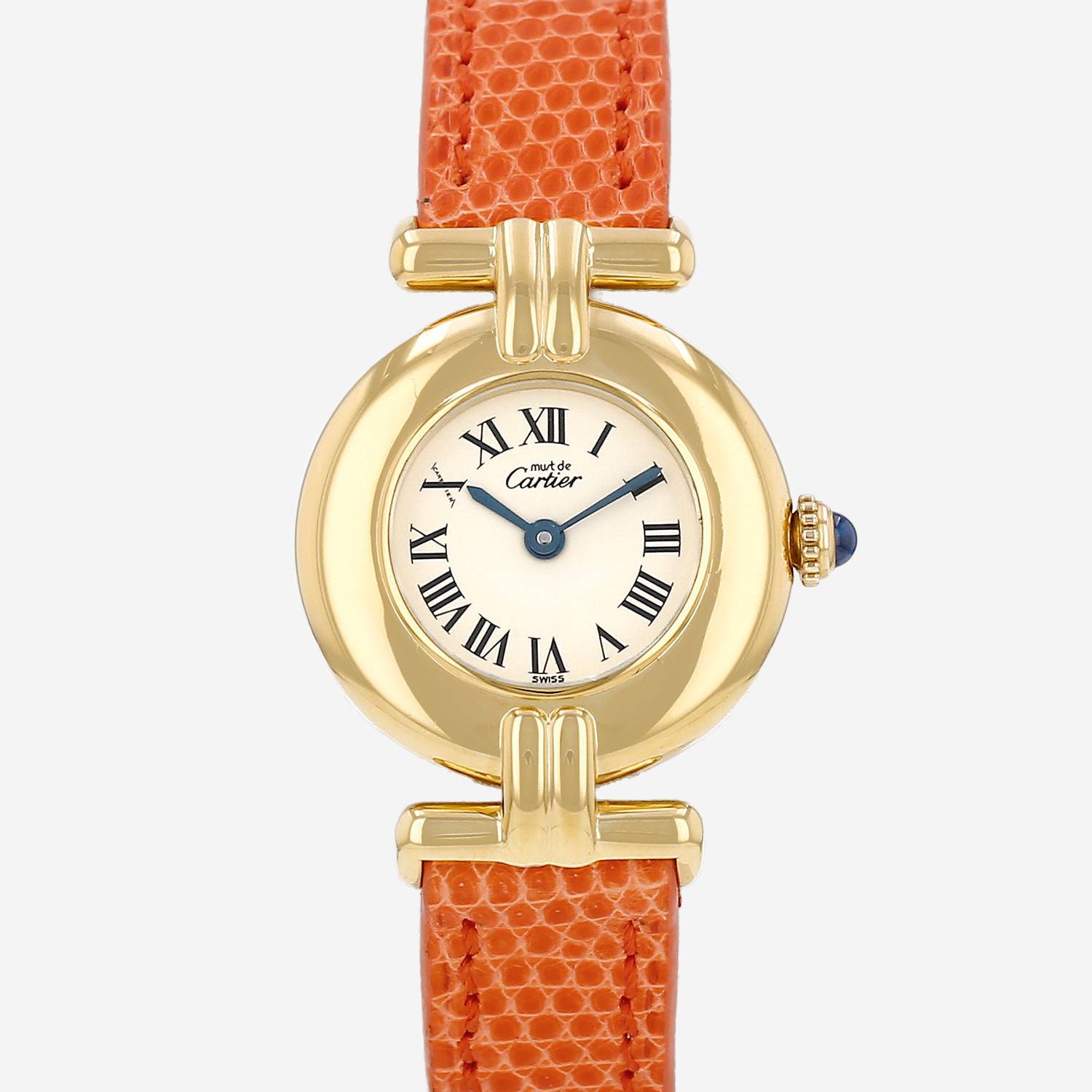 Orologio da polso Cartier Must Colisée in vermeil. Cassa rotonda in vermeil, fondo cassa fissato con clip, corona scanalata incastonata con un cabochon in zaffiro.