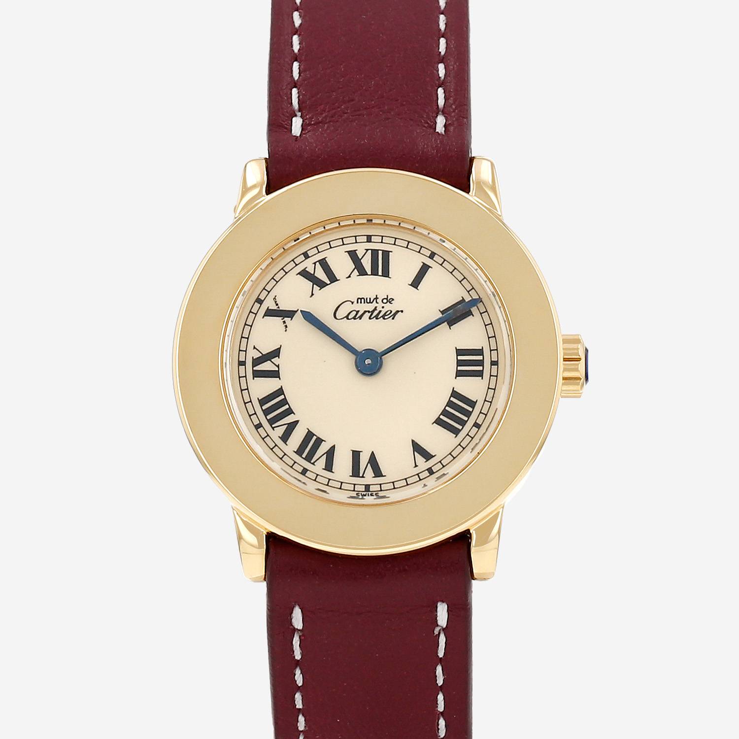 Orologio da polso Cartier Must II in vermeil. Cassa rotonda in vermeil, fondo cassa avvitato, corona scanalata incastonata con un cabochon in zaffiro.