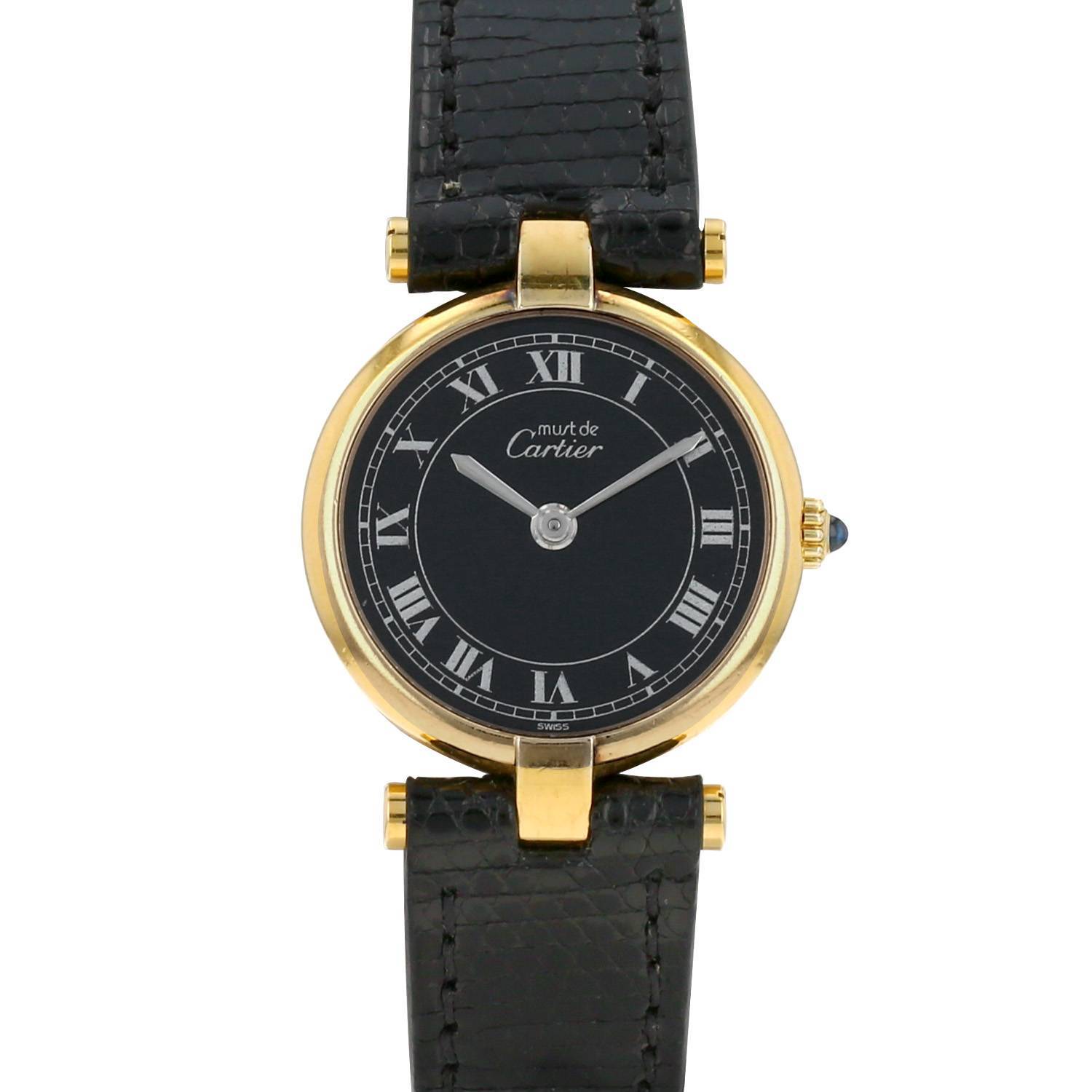 Orologio da polso Cartier Must Vendôme in vermeil. Cassa rotonda in vermeil, fondo cassa avvitato, corona scanalata incastonata con un cabochon in zaffiro.