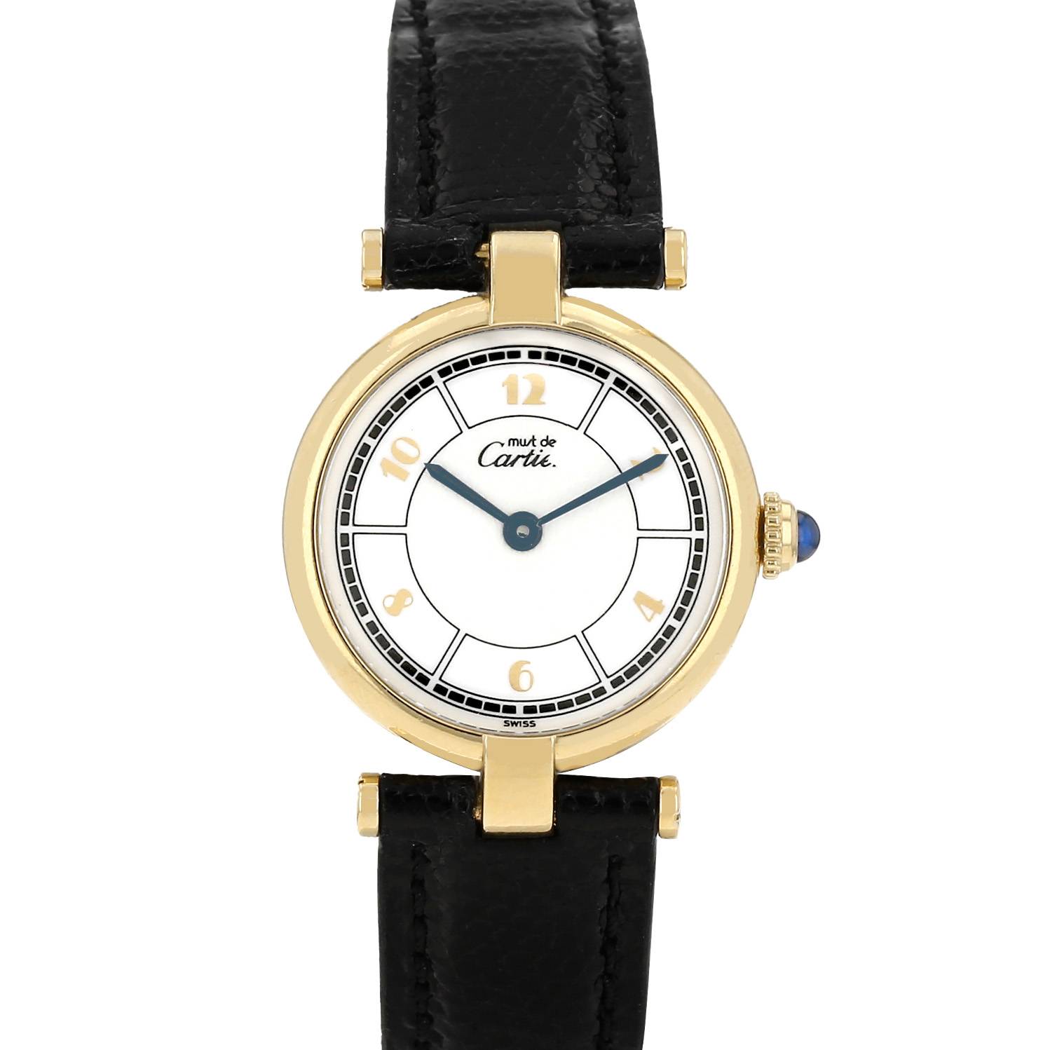 Orologio da polso Cartier Must Vendôme in vermeil. Cassa rotonda in vermeil, fondo cassa avvitato, corona scanalata incastonata con un cabochon in zaffiro.