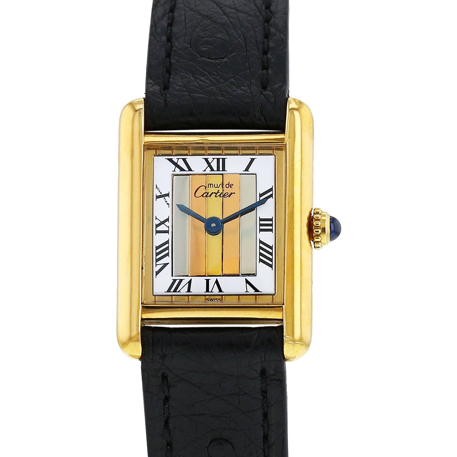 Orologio da polso Cartier Tank Must in vermeil. Cassa quadrata in vermeil, corona incastonata con un cabochon in zaffiro.