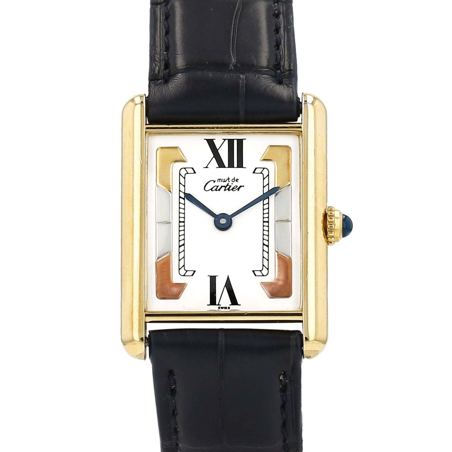 Orologio da polso Cartier Tank Must in vermeil. Cassa rettangolare in vermeil, fondo cassa avvitato, corona scanalata incastonata con un cabochon in zaffiro.