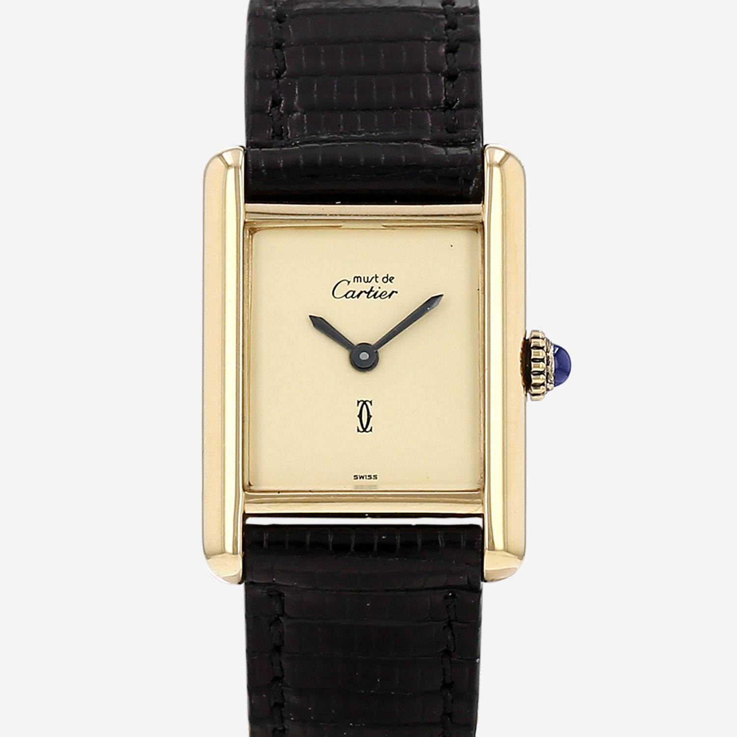 Orologio da polso Cartier Tank Must in vermeil. Cassa rettangolare in vermeil, fondo cassa avvitato, corona incastonata con un cabochon in zaffiro.