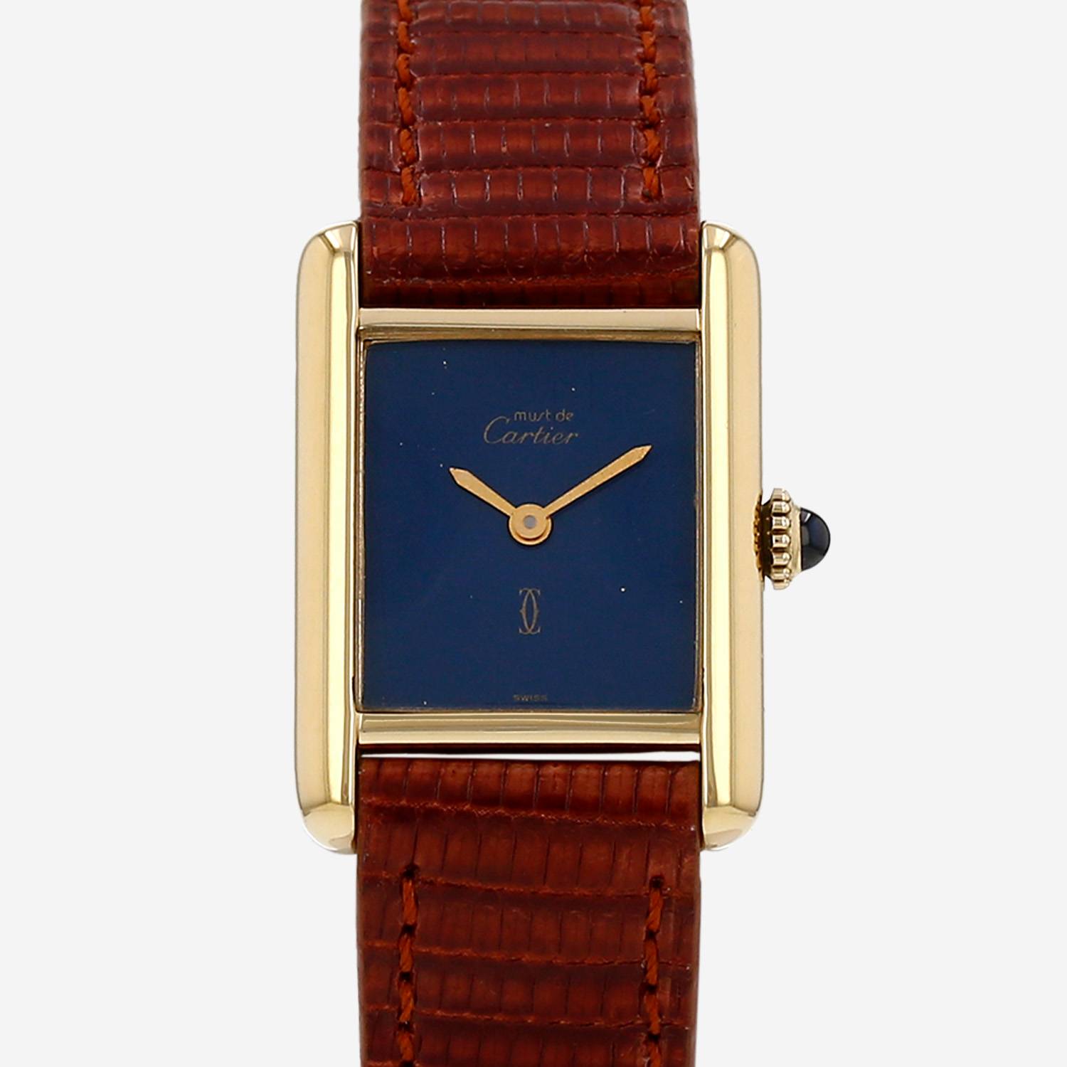 Orologio da polso Cartier Tank Must in vermeil. Cassa rettangolare in vermeil, fondo cassa avvitato, corona scanalata incastonata con un cabochon in zaffiro.