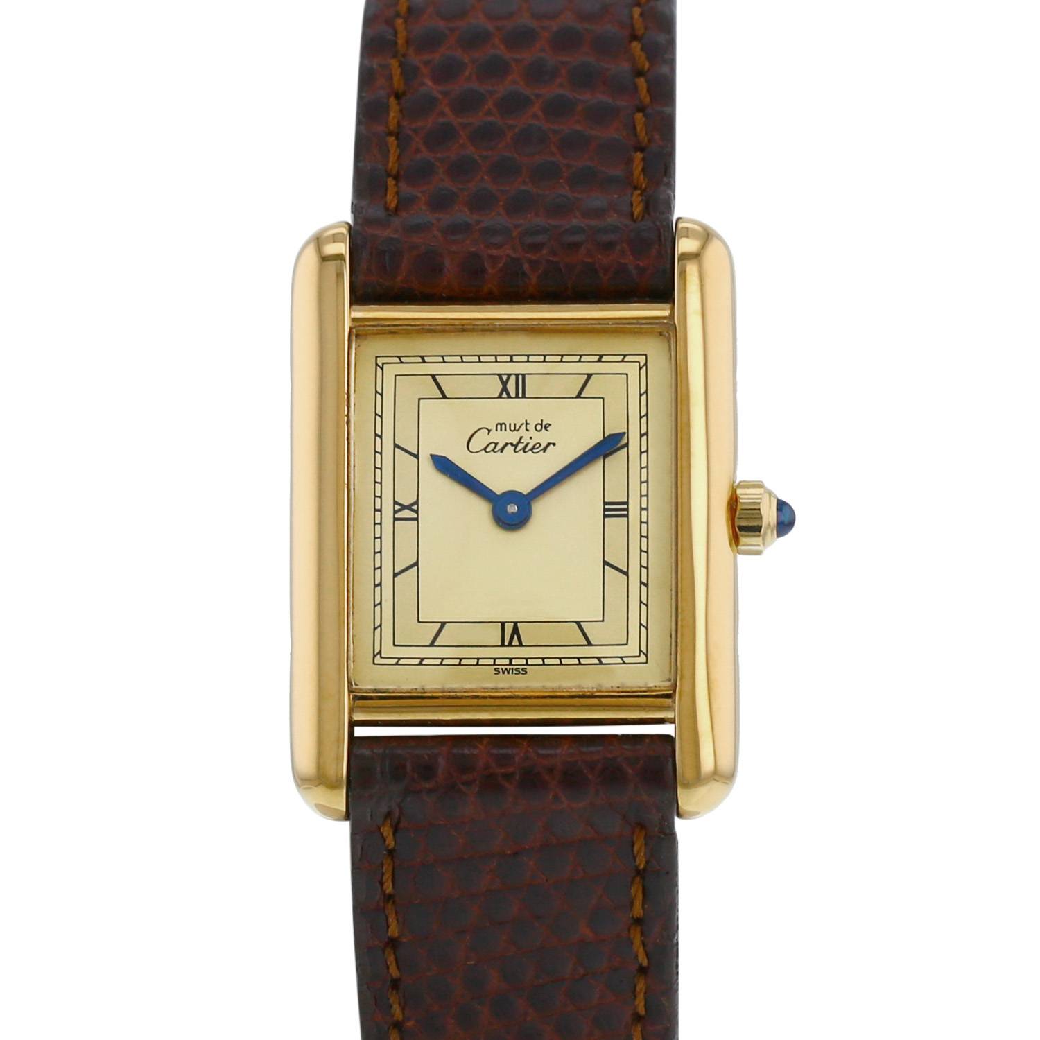 Orologio da polso Cartier Tank Must in vermeil. Cassa rettangolare in vermeil, fondo cassa avvitato, corona incastonata con un cabochon in zaffiro.