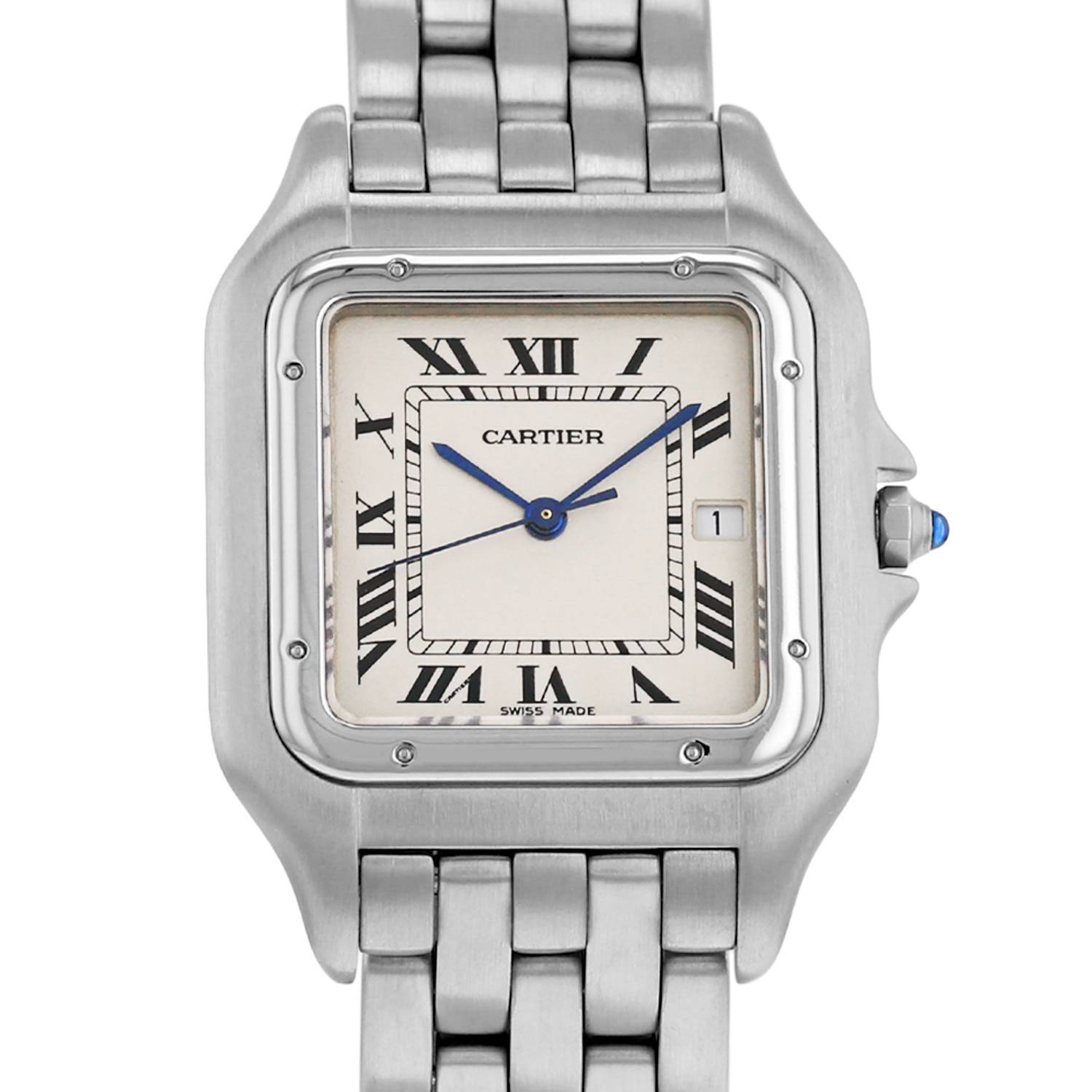 Orologio da polso Cartier Panthère in acciaio. Cassa quadrata in acciaio, fondo cassa avvitato, lunetta avvitata, corona scanalata incastonata con un cabochon in zaffiro.