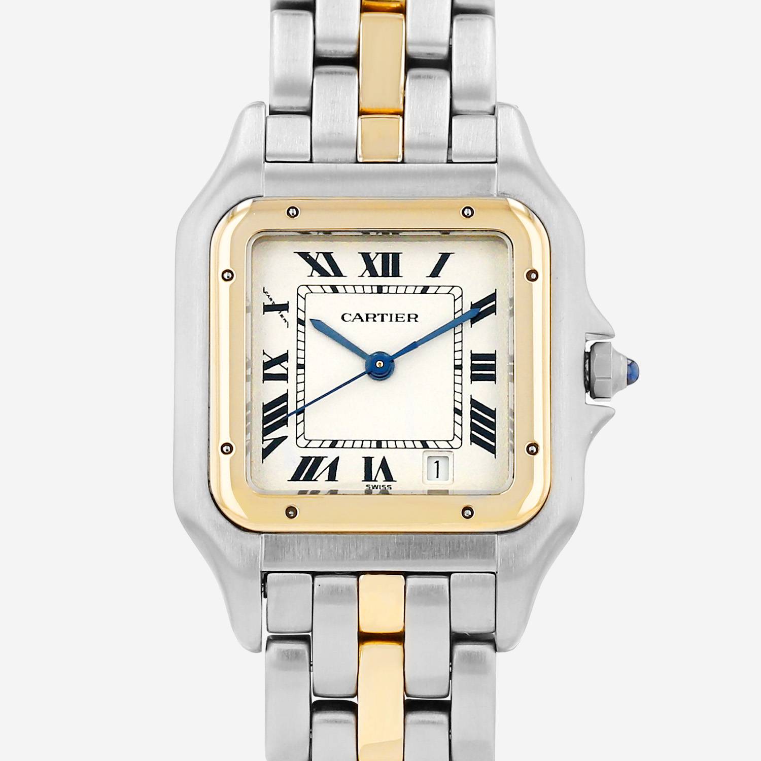 Orologio da polso Cartier Panthère modello medio in oro e acciaio. Cassa quadrata in oro e acciaio, fondo cassa avvitato, lunetta avvitata in oro giallo, corona scanalata incastonata con un cabochon in zaffiro.