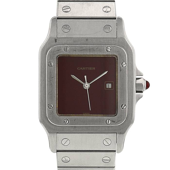 Elegante e originale orologio da polso Cartier Santos in acciaio. Cassa quadrata in acciaio, fondo cassa avvitato, lunetta avvitata in acciaio, corona incastonata con un cabochon rosso.