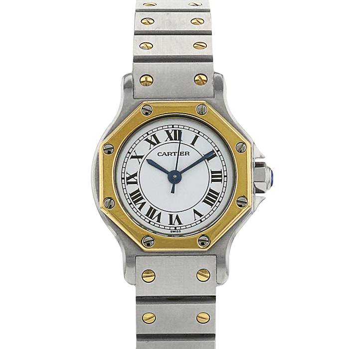 Elegante orologio da donna Cartier in acciaio e oro giallo. Cassa ottagonale in acciaio, fondo cassa avvitato, lunetta a vite ottagonale in oro giallo, corona scanalata.