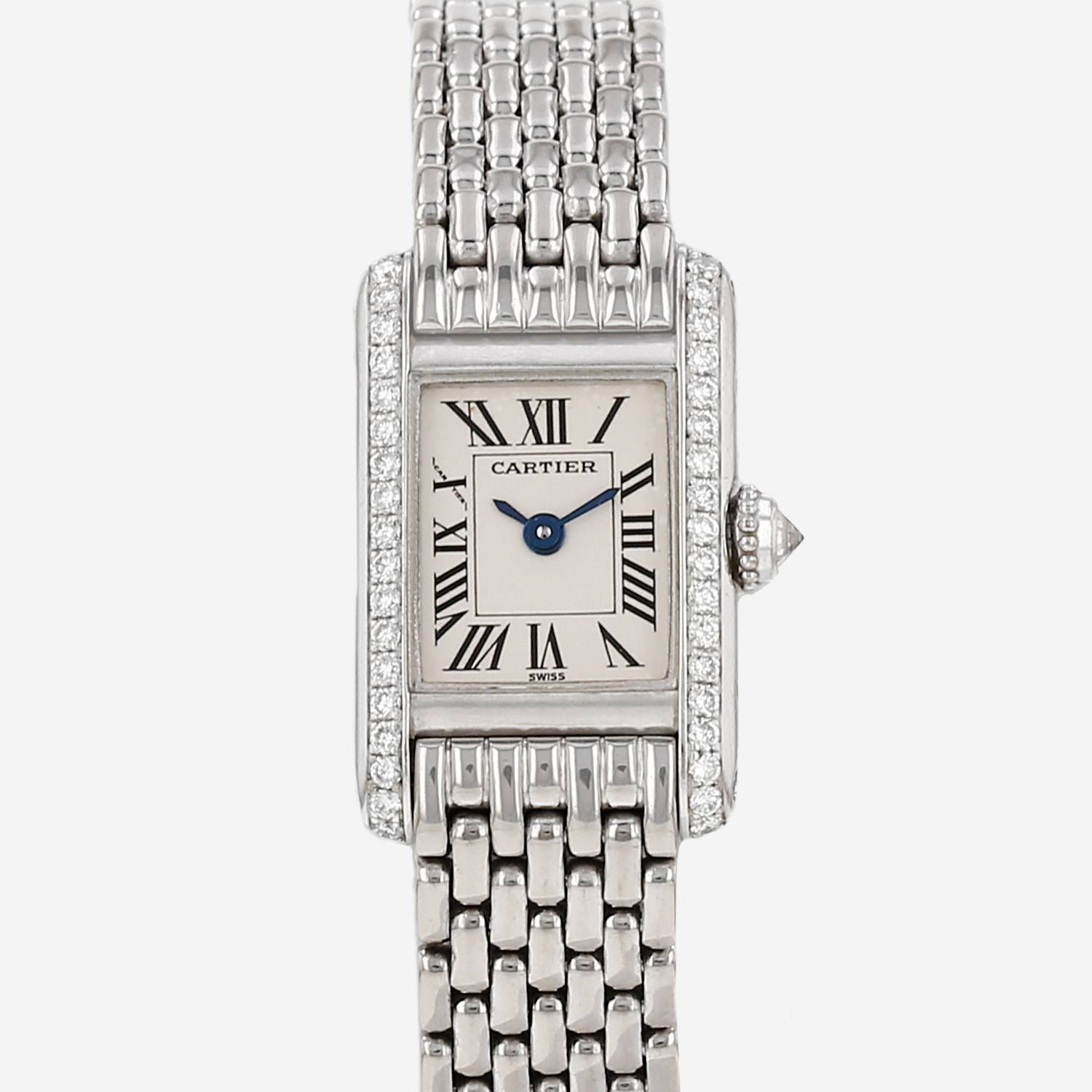 Orologio da polso Cartier Mini Tank e oro bianco. Cassa rettangolare in oro bianco diamantata, fondo cassa avvitato, corona incastonata con un cabochon di diamanti.