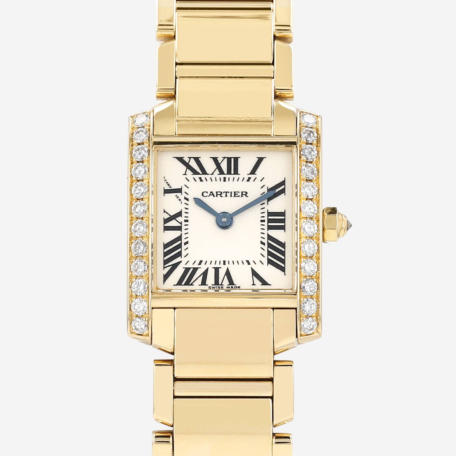 Orologio da polso Cartier Tank Française in oro giallo. Cassa rettangolare in oro giallo diamantata, fondo cassa avvitato, corona incastonata con un cabochon di diamanti.