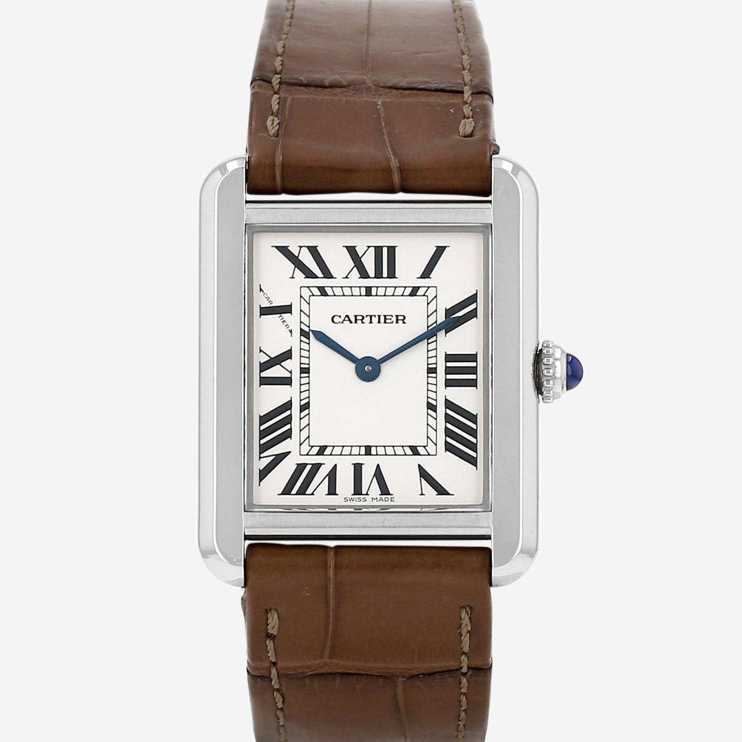 Orologio da polso maschile Cartier Tank Solo modello medio in acciaio e acciaio. Cassa rettangolare in acciaio, fondo cassa avvitato, corona scanalata incastonata con un cabochon in zaffiro.