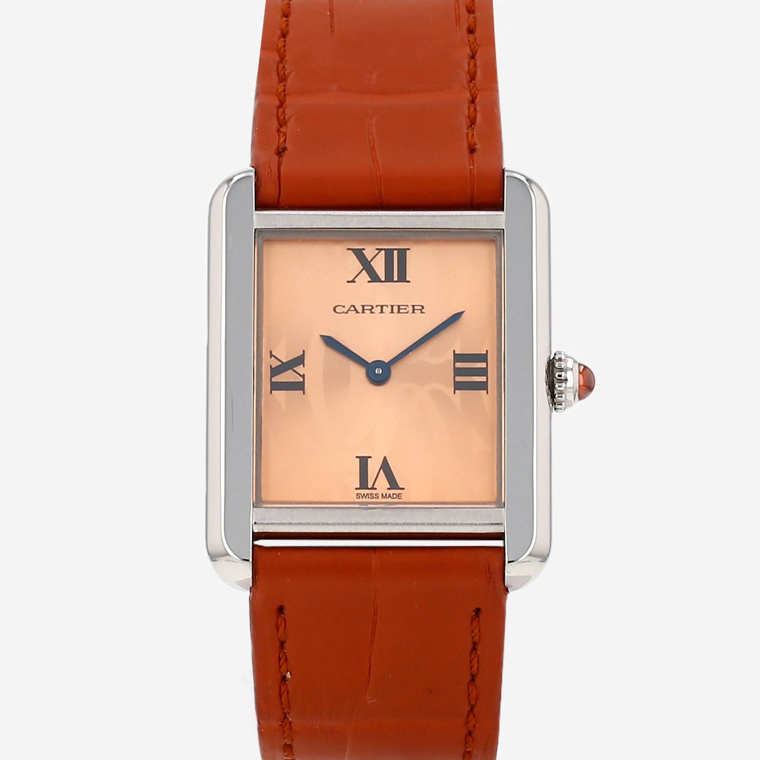 Orologio da polso maschile Cartier Tank Solo modello piccolo in acciaio. Cassa rettangolare in acciaio, fondo cassa avvitato, corona scanalata incastonata con un cabochon.