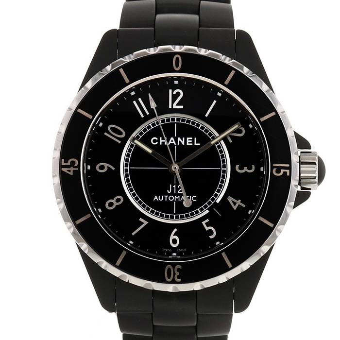 Bello orologio da polso maschile Chanel J12 in ceramica nera. Cassa rotonda in acciaio, fondo cassa avvitato, lunetta graduata girevole monodirezionale, corona a vite.