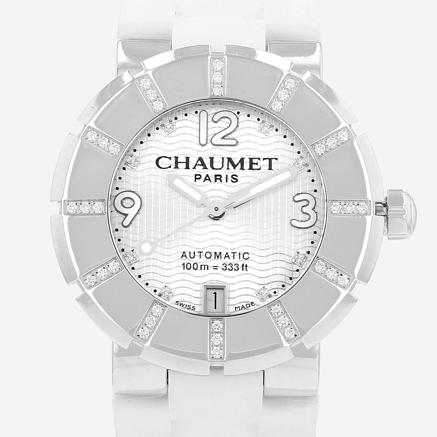 Orologio da polso Chaumet Class One in acciaio. Cassa rotonda in acciaio, fondo cassa avvitato con movimento a vista sul retro della cassa, lunetta graduata girevole monodirezionale diamantata, corona scanalata.