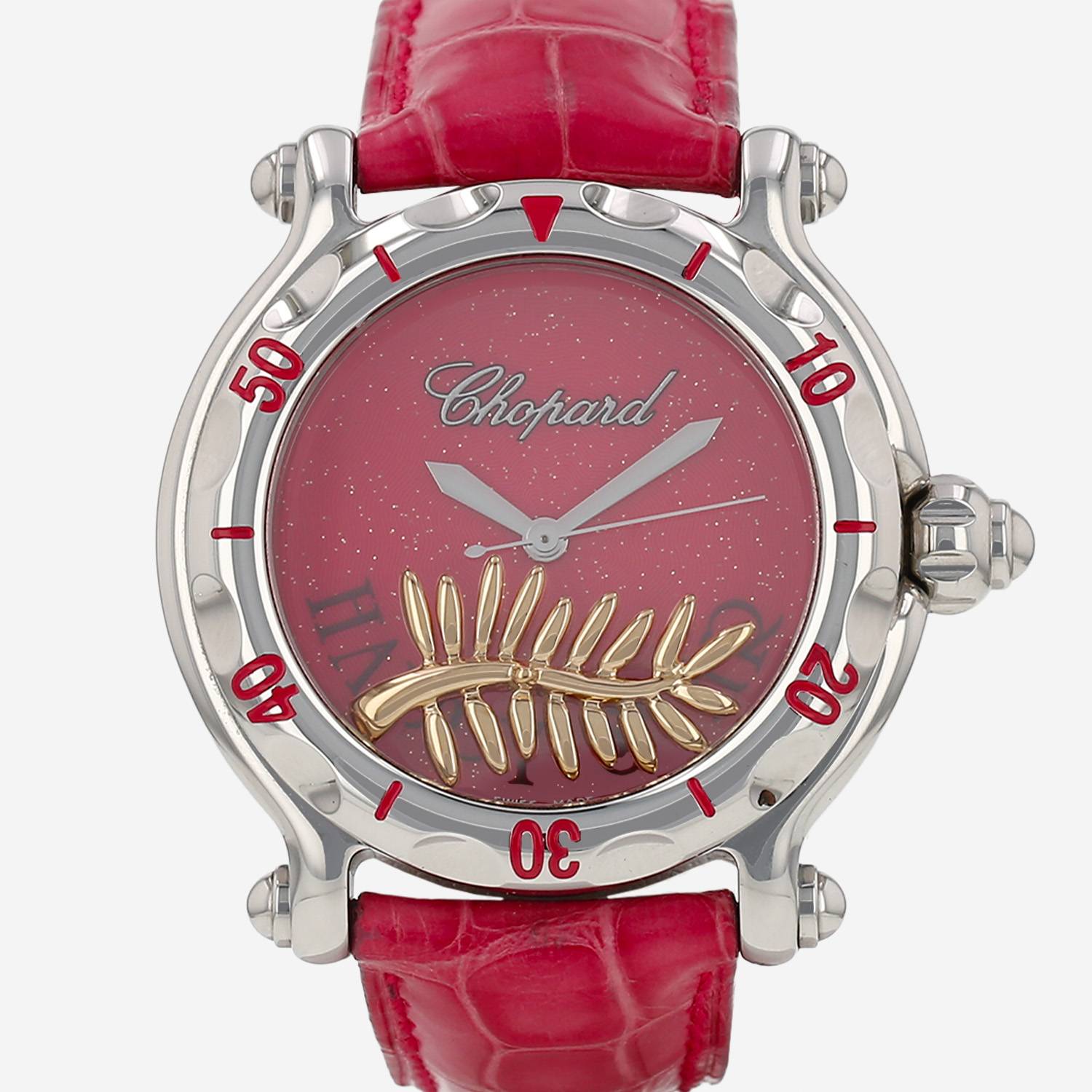 - Cinturino in pelle rosa firmato Chopard, fibbia ad ardiglione in acciaio firmata Chopard.