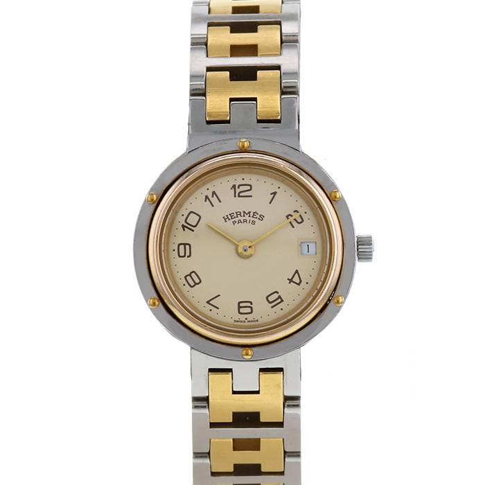 Orologio da donna Hermes Clipper in acciaio e oro placcato. Cassa rotonda in acciaio, fondo cassa fissato con clip, lunetta avvitata in oro placcato, corona scanalata.