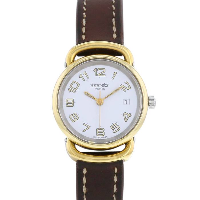 Orologio da polso Hermès Pullman in acciaio e oro placcato. Cassa rotonda in acciaio, fondo cassa fissato con clip, lunetta in oro placcato, corona scanalata.