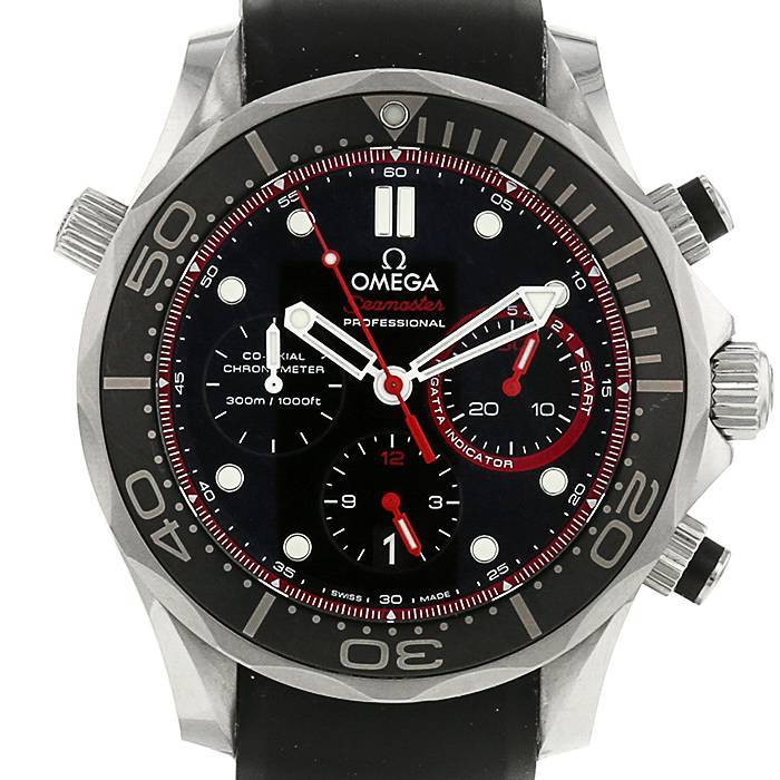 Straordinario cronografo Omega Seamaster Diver in acciaio. Cassa rotonda in acciaio, pulsanti a pompa, lunetta graduata girevole monodirezionale, corona scanalata.