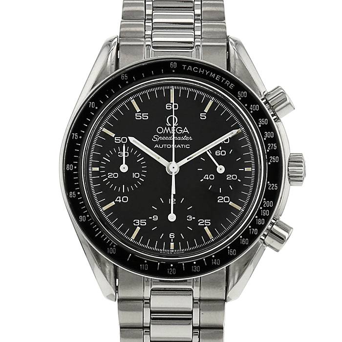 Orologio cronografo da polso Omega Speedmaster Automatic in acciaio. Cassa rotonda in acciaio, pulsanti lisci, lunetta tachimetrica in acciaio nero, corona scanalata.