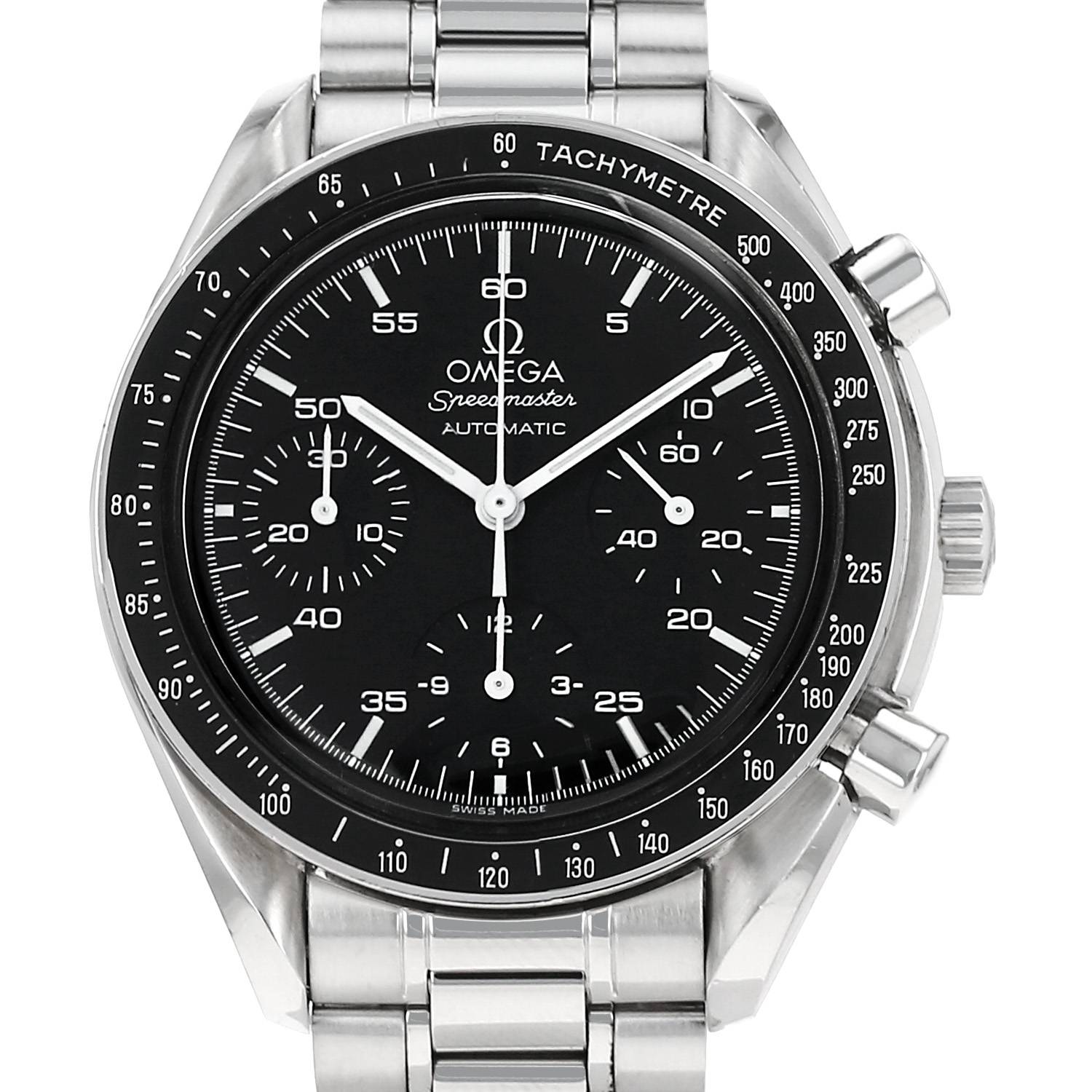 Orologio da polso Omega Speedmaster Automatic in acciaio. Cassa rotonda in acciaio, fondo cassa fissato con clip, pulsanti rotondi a pompa, alle 2 e alle 4, lunetta tachimetrica in acciaio, corona scanalata.