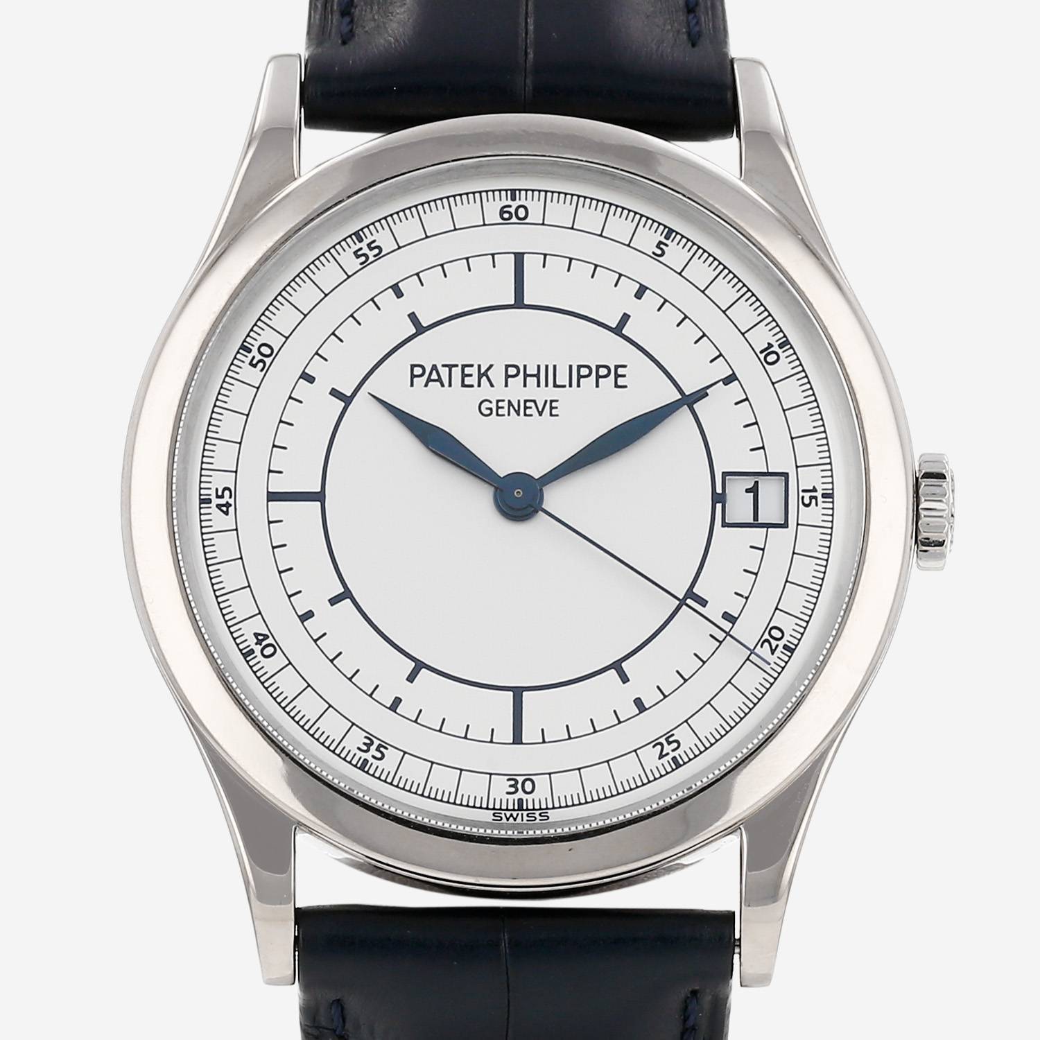 Orologio da polso Patek Philippe Calatrava in oro bianco. Cassa rotonda in oro bianco, fondo cassa avvitato con movimento a vista sul retro della cassa, corona scanalata.