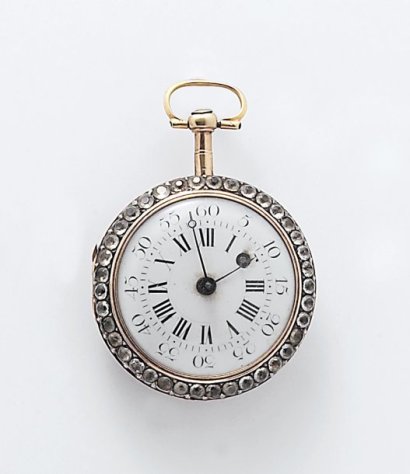 Descrizione : Montre à verge en or jaune uni. La carrure sertie de pierres du Rhin. Cadran émaillé. La platine signée Vauchez à Paris. Coq ajouré en laiton doré. Epoque Louis XVI (restaurations). Diam: 42 mm.
