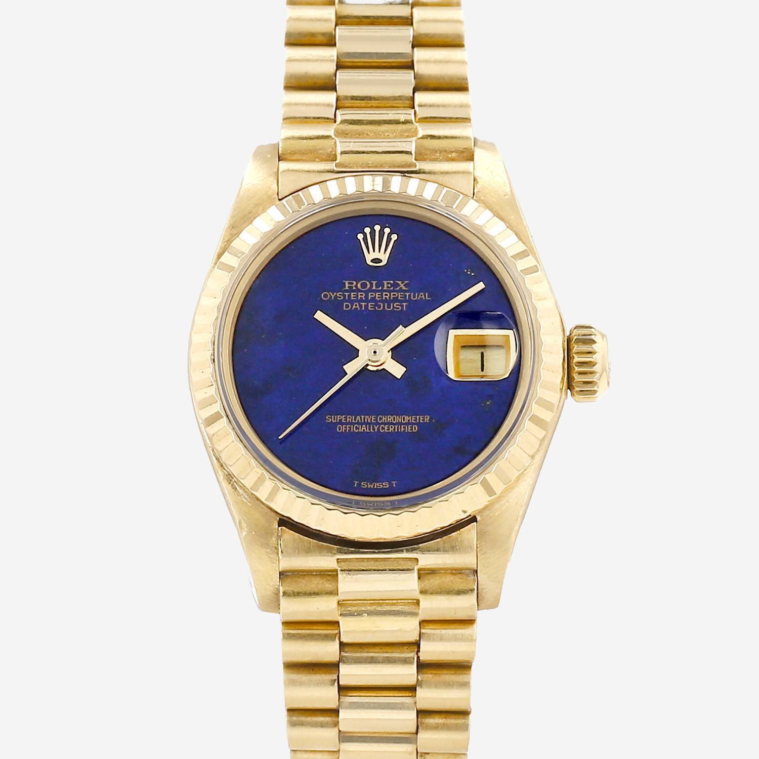 Orologio da polso Rolex Datejust Lady in oro giallo. Cassa rotonda in oro giallo, fondo cassa avvitato, lunetta zigrinata in oro giallo, corona a vite.
