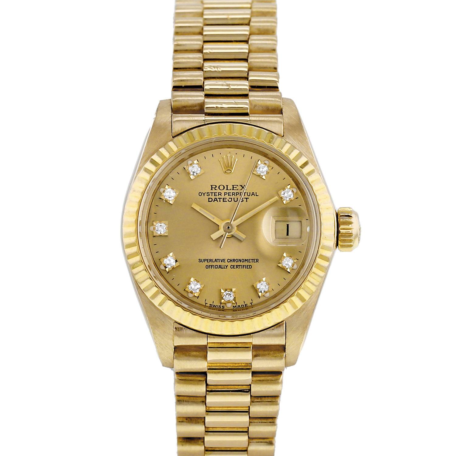 Orologio da polso Rolex Datejust Lady in oro giallo. Cassa rotonda in oro giallo, fondo cassa avvitato, lunetta zigrinata in oro giallo, corona a vite.