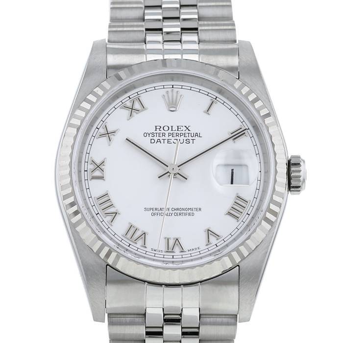 Orologio da polso Rolex Datejust in acciaio. Cassa rotonda in acciaio, fondo cassa avvitato, lunetta zigrinata in oro bianco, corona a vite.