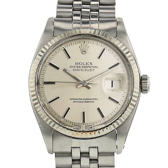 Famoso orologio da polso Rolex Datejust in acciaio. Cassa rotonda, fondo cassa avvitato, lunetta zigrinata in oro bianco 14k, corona a vite.