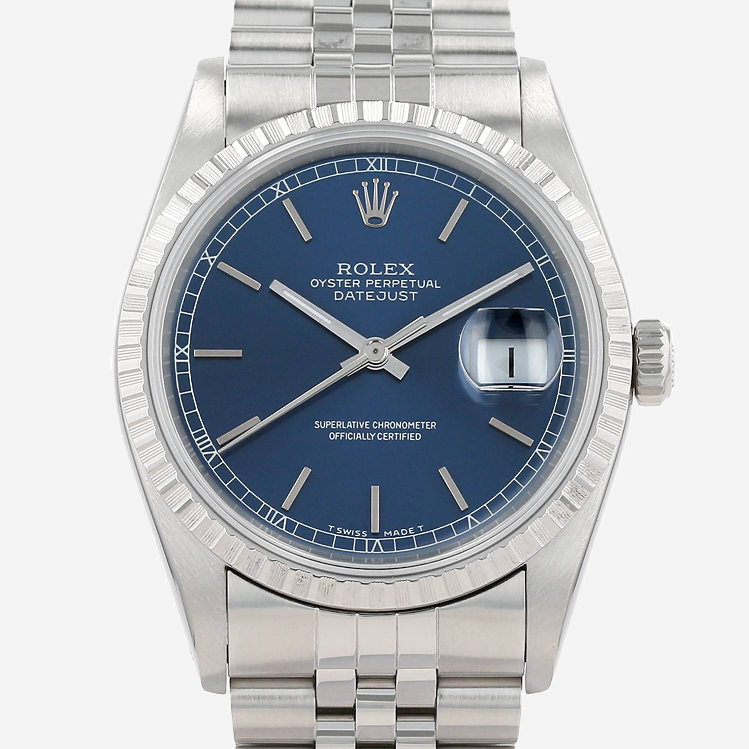 Orologio da polso Rolex Datejust in acciaio. Cassa rotonda in acciaio, fondo cassa avvitato, lunetta zigrinata in acciaio, corona a vite.