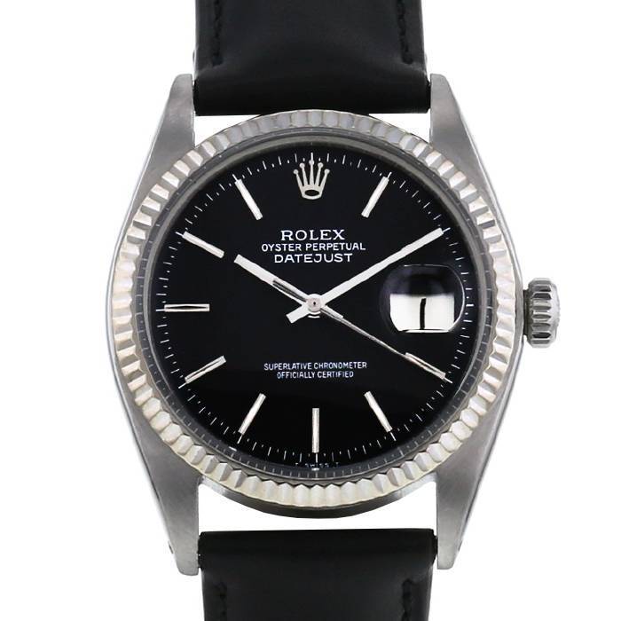 Orologio da polso Rolex Datejust in acciaio e oro bianco 14k. Cassa rotonda in acciaio, fondo cassa avvitato, lunetta zigrinata in oro bianco 14k, corona a vite.