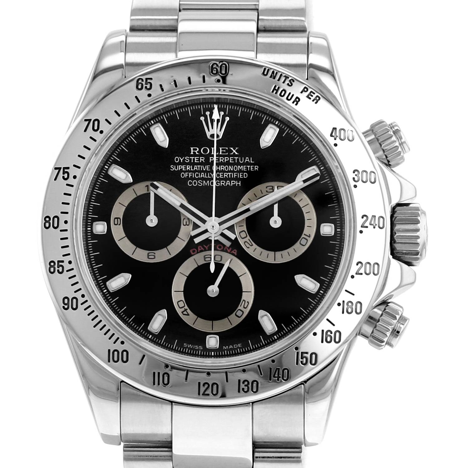 Orologio cronografo da polso Rolex Daytona Automatique in acciaio. Cassa rotonda in acciaio, fondo cassa avvitato, pulsanti a vite, alle 2 e alle 4, lunetta graduata con scala tachimetrica in acciaio, corona a vite.