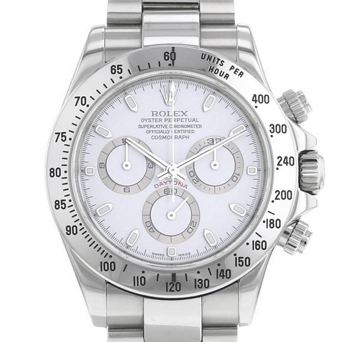 Cronografo da polso Rolex Daytona in acciaio. Cassa rotonda in acciaio, fondo cassa avvitato, lunetta graduata, corona a vite.