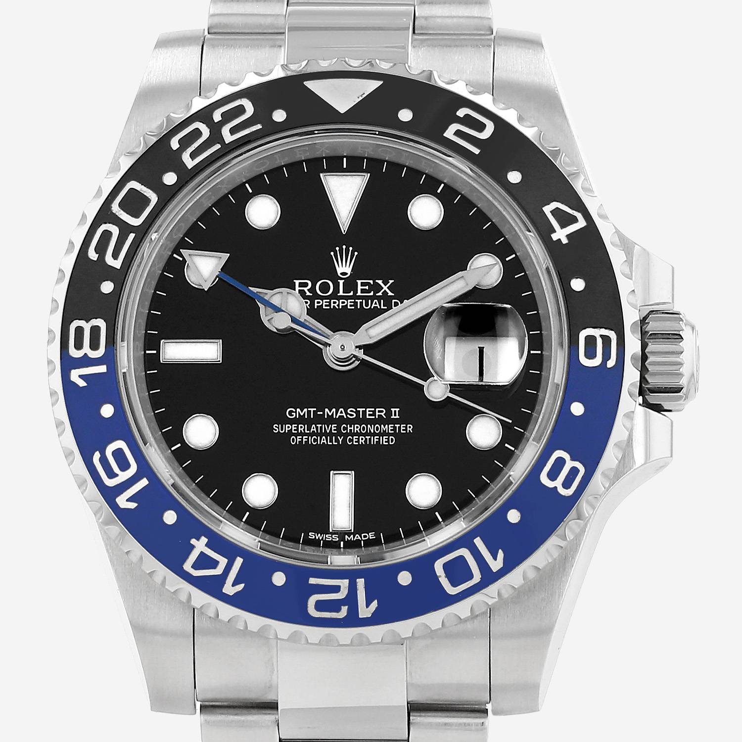 Orologio da polso Rolex GMT-Master II in acciaio. Cassa rotonda in acciaio, fondo cassa avvitato, lunetta girevole graduata su 24 ore, corona a vite.
