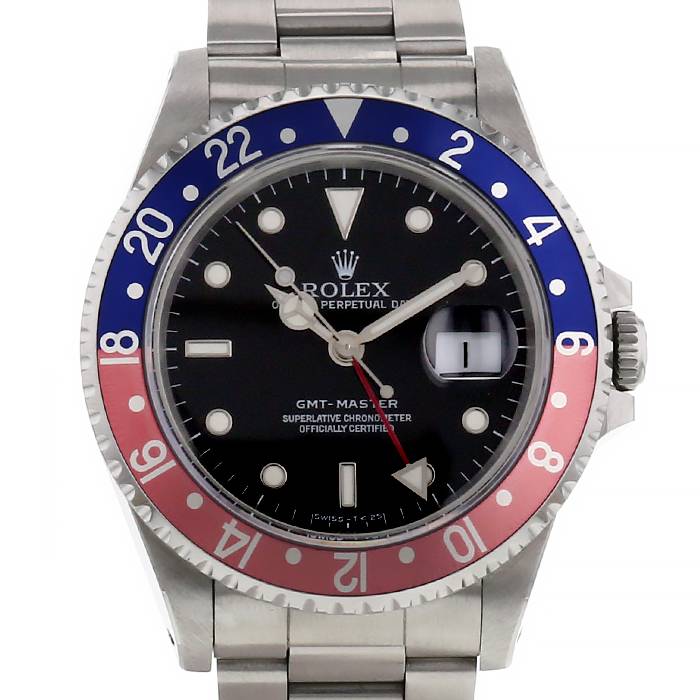 Orologio da polso Rolex GMT-Master in acciaio. Cassa rotonda in acciaio, fondo cassa avvitato, lunetta graduata girevole monodirezionale in alluminio blu e rosso, corona a vite.