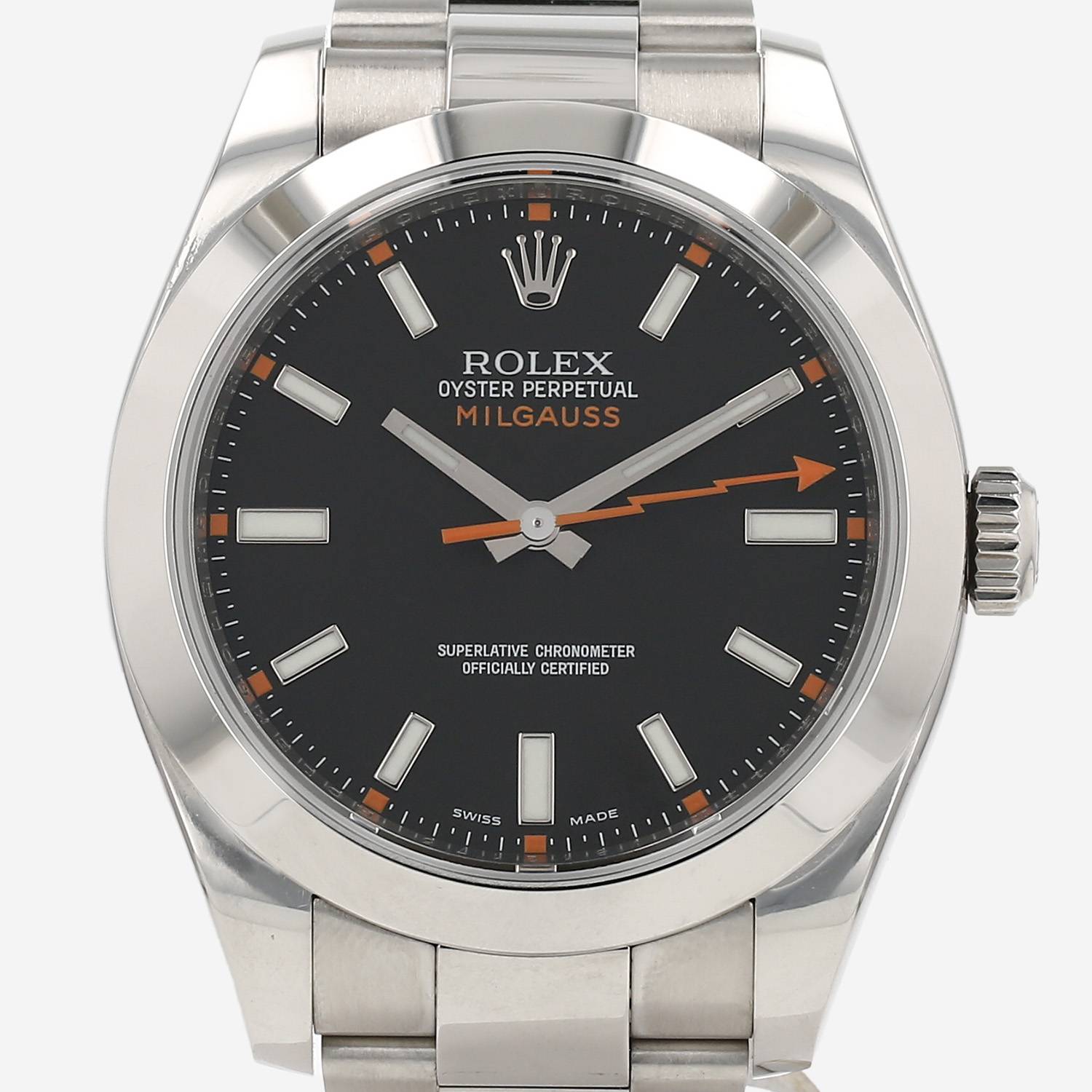 Orologio da polso Rolex Milgauss in acciaio. Cassa rotonda in acciaio, fondo cassa avvitato, lunetta liscia, corona a vite.