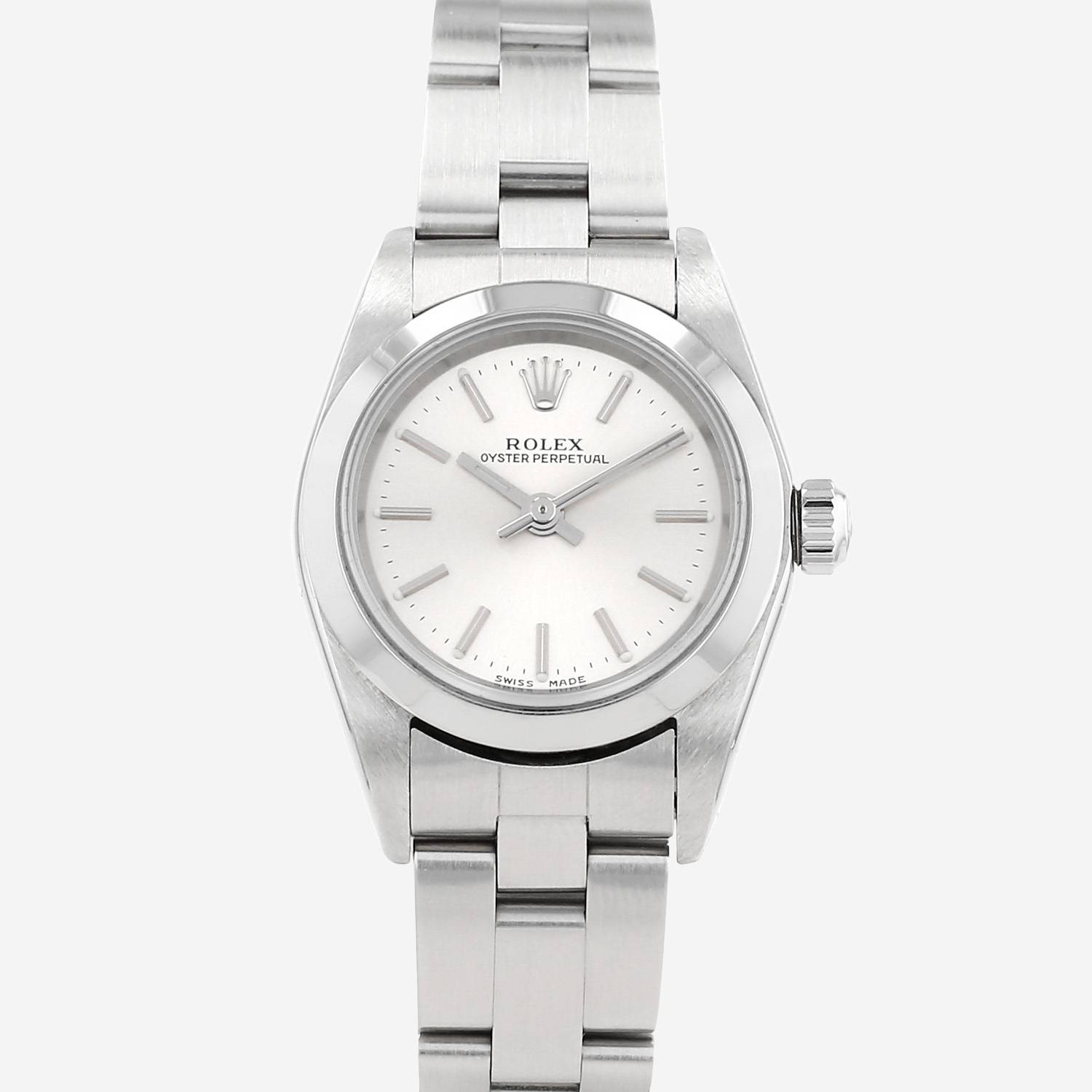 Orologio da polso Rolex Lady Oyster Perpetual in acciaio. Cassa rotonda in acciaio, fondo cassa avvitato, lunetta liscia, corona a vite.