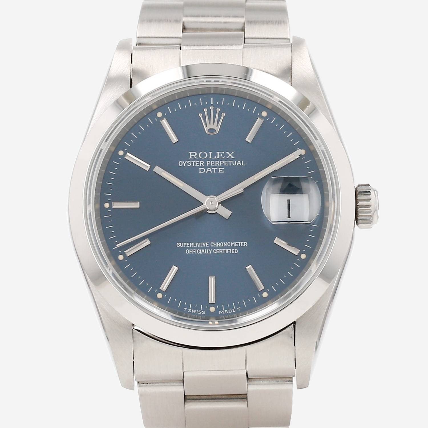 Orologio da polso Rolex Oyster Perpetual Date in acciaio. Cassa rotonda in acciaio, fondo cassa avvitato, lunetta liscia, corona a vite.