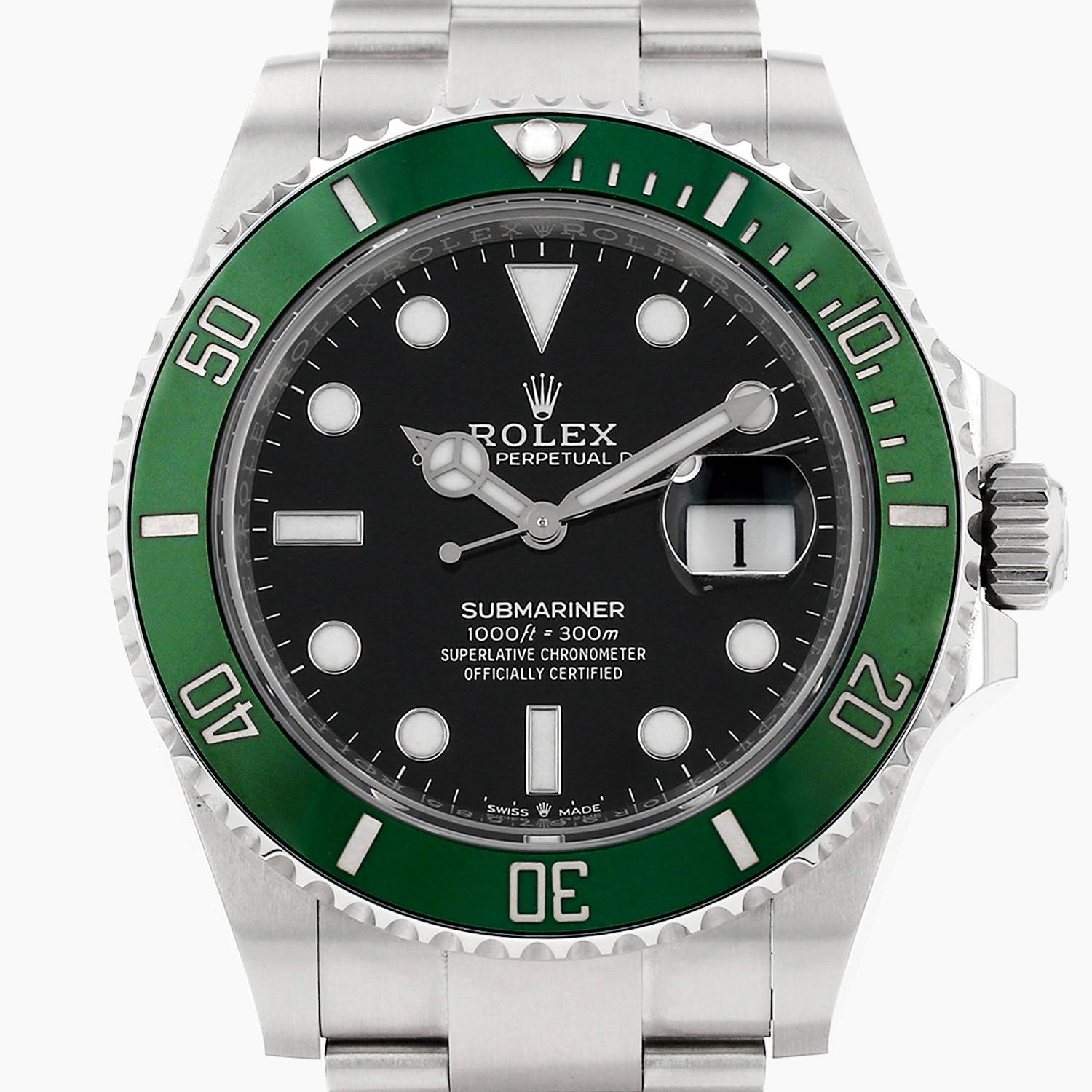 Orologio da polso Rolex Submariner Date in acciaio. Cassa rotonda in acciaio, fondo cassa avvitato, lunetta graduata girevole monodirezionale verde, corona a vite.