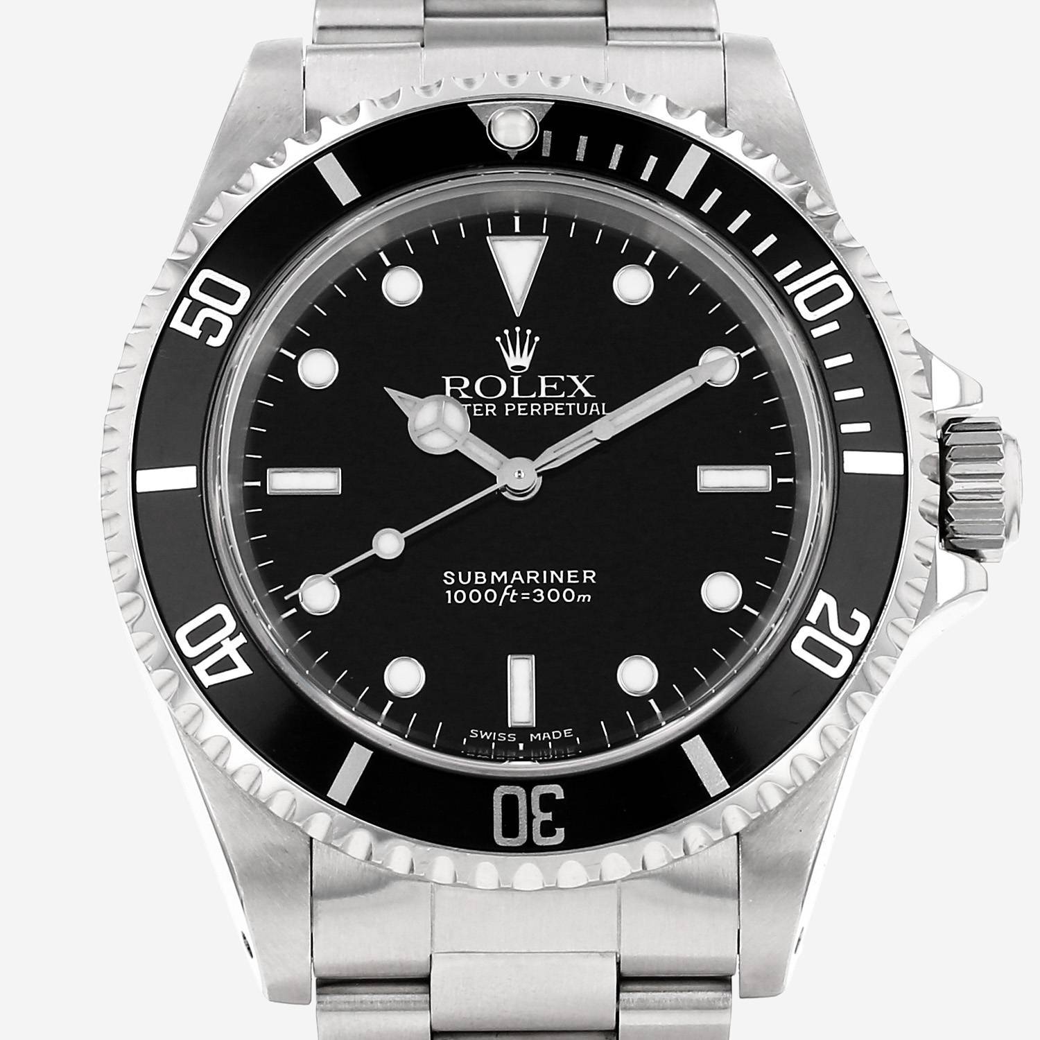 Orologio da polso Rolex Submariner in acciaio. Cassa rotonda in acciaio, fondo cassa avvitato, lunetta graduata girevole monodirezionale, corona a vite.