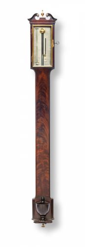 Descrizione : Adams, Fleet Street, London;The swan neck pediment centred by a brass urn finial over a locking brass-framed hinged glazed door revealing the signed silvered dial with mercury thermometer and tube, the scale from 27 to 32 inches with seven weather predictions and manual vernier, over a flame-veneered trunk terminating in a turned ebonised urn cistern cover flanked by canted angles 102cm (40in) highLeggi la descrizione dell'espertoA late 18th century mahogany stick barometer