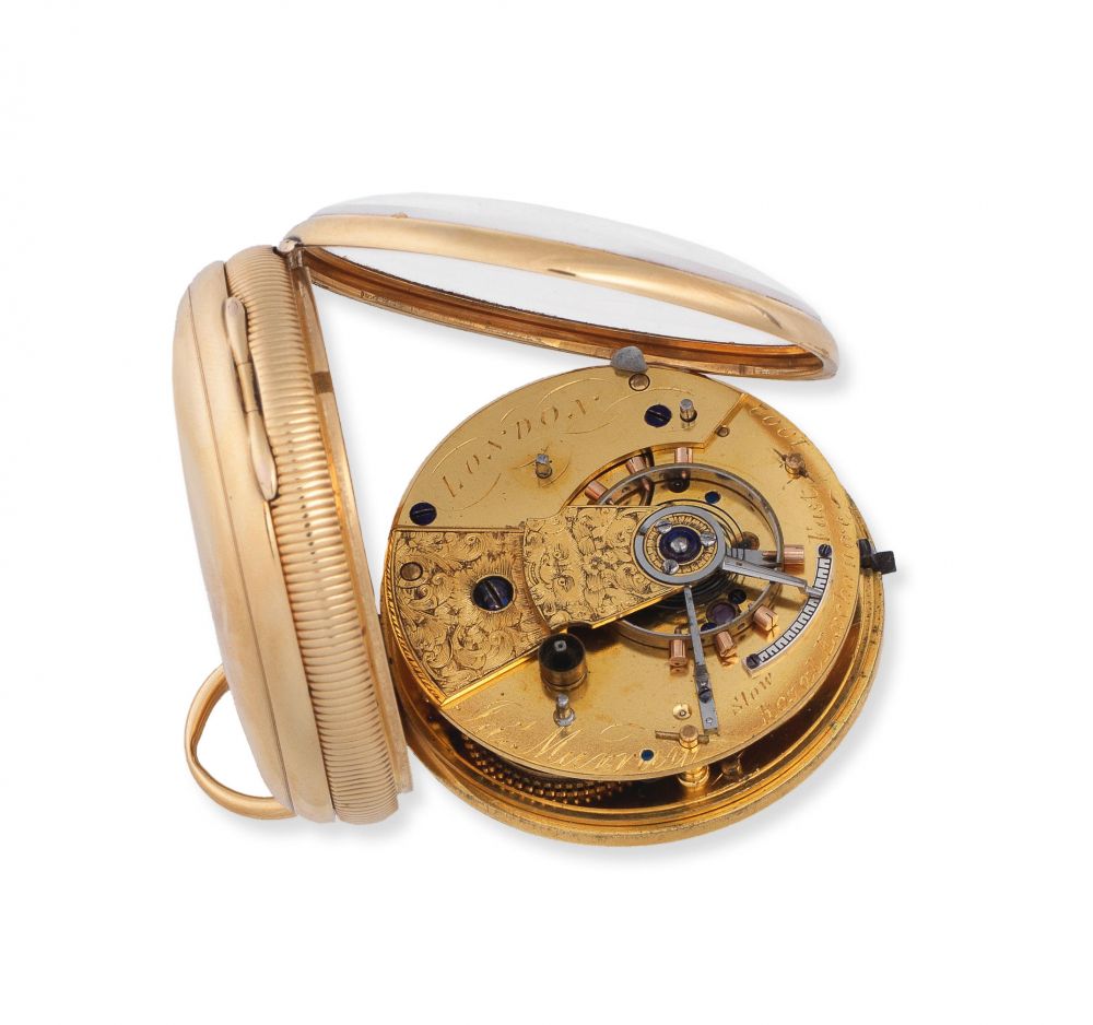 Description : Date: London Hallmark for 1824,Movement: Gilt full plate duplex, cut and compensated balance, diamond end stone, No.1002,Dial: White, black Roman numerals, black outer minute divisions, subsidiary seconds at 6, blued steel hands,Case: Engine turned consular, reeded band, signed inner cap stamped RE, No.1002,Signed: Dial, cap & movement,Size: 52mmVoir la description de notre expertJames Murray, Royal Exchange, London. An 18K gold key wind open face pocket watch with duplex escapement
