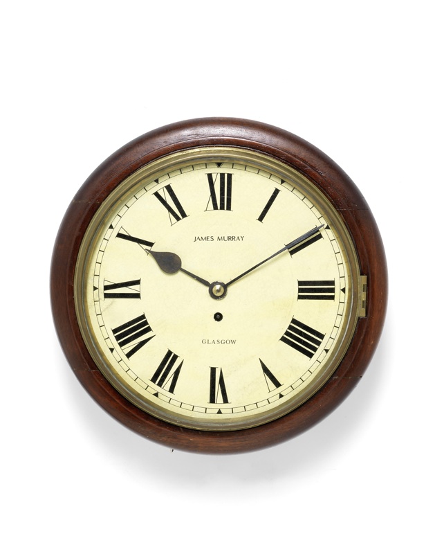 Description : James Murray, Glasgow The mahogany case with signed painted 12 inch dial, Roman numerals, spun bezel and painted spade hands to the single chain fusee movement with anchor escapement 39cm (15.5in) wide.Voir la description de notre expertA late 19th century mahogany wall clock