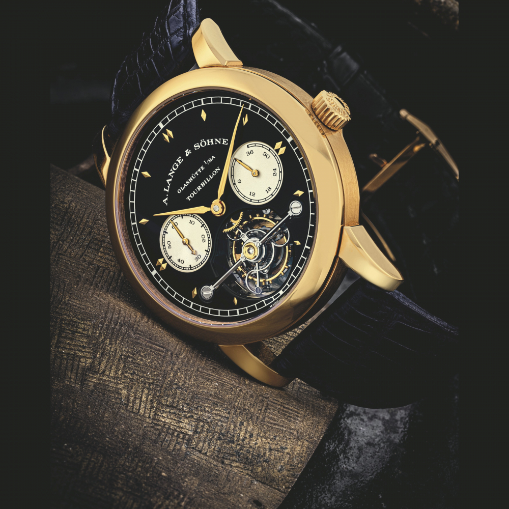 A. LANGE & SÖ HNE. A VERY FINE AND RARE 18K GOLD LIMITED EDITION TOURBILL ON WRISTWATCH WITH CHAIN FUSÉ E AND POWER RESERVE