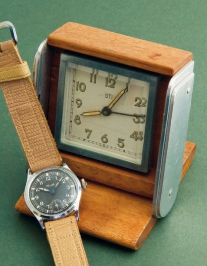 Description : LOT MILITARIA (Montre Kienzle - Réveil Uti), vers 1935 Lot constitué: 1. Kienzle: Montre militaire allemande en acier chromé à fond clipsé. Cadran noir chemin de fer à petite trotteuse seconde 6h. Chiffres peints et index perle luminescents, aiguilles squelette. Mouvement: Calibre mécanique remontage manuel Swiss. Diam. 30 mm. Etat: Très Bon état. 2. UTI: Réveil en alliage à boîtier en bois à fermeture toboggan, cadran chemin de fer, aiguilles luminova. Dim. 72 x 84 mm. Etat: Très Bon état. -